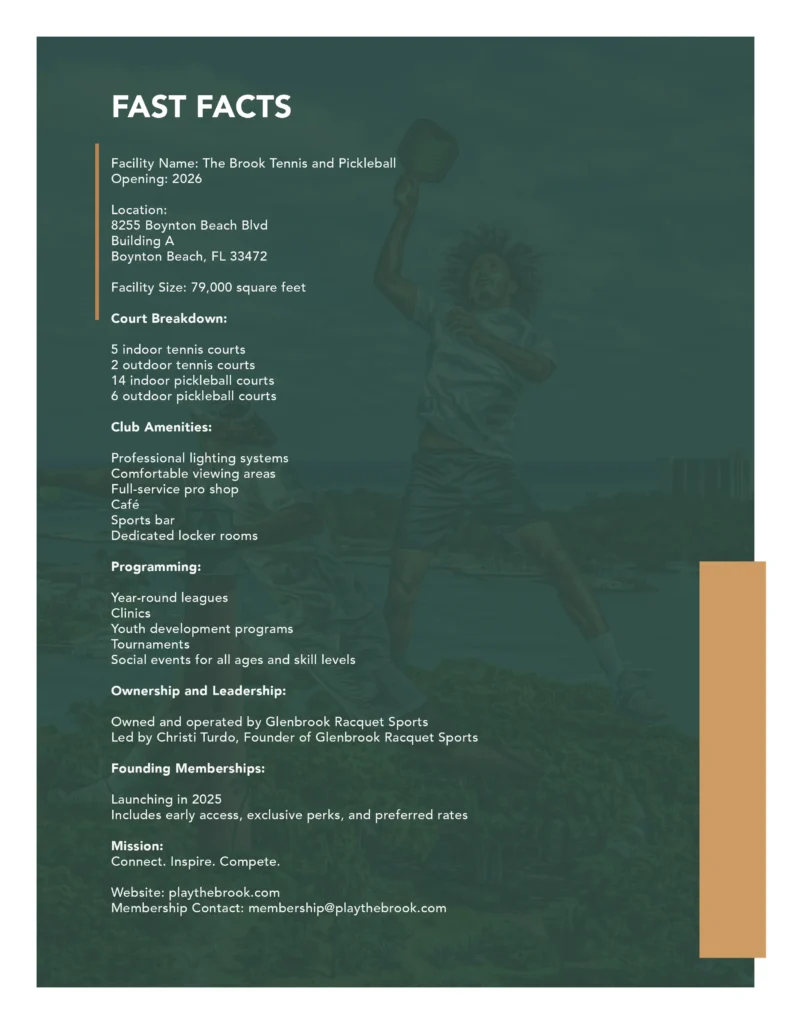 Designed for athletes, enthusiasts, and everyday competitors, The Brook brings together the energy of the game and the comfort of community under one roof. With 79,000 square feet of climate-controlled courts, lounge spaces, and year-round programming, it’s where athletes and enthusiasts come together to celebrate the spirit of the game year-round.